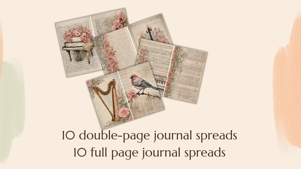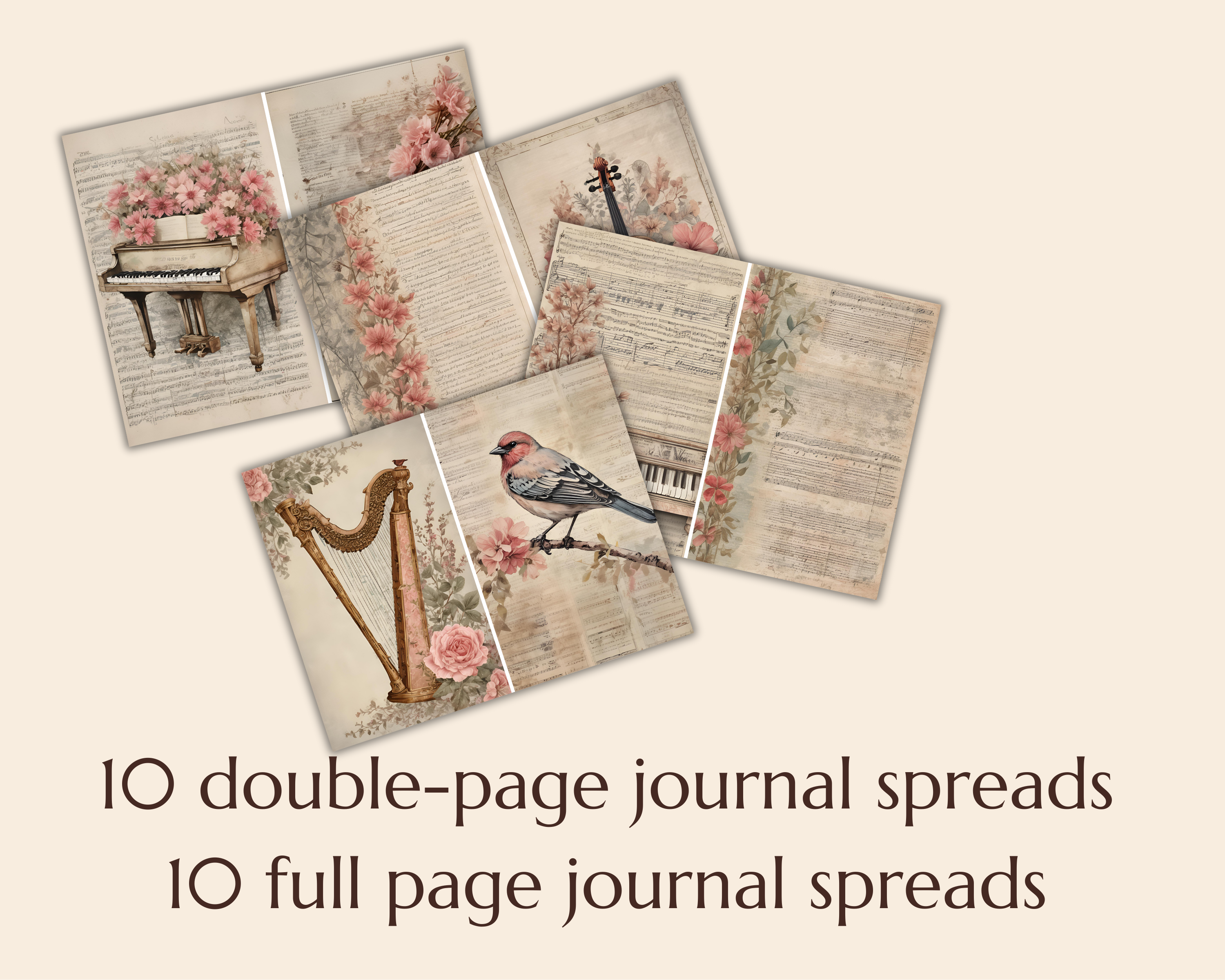 A vintage-inspired junk journal kit featuring floral and music-themed printable pages, cards, pockets, and ephemera. Perfect for music lovers, journalers, and paper crafters. Instant download (PDF + PNG)