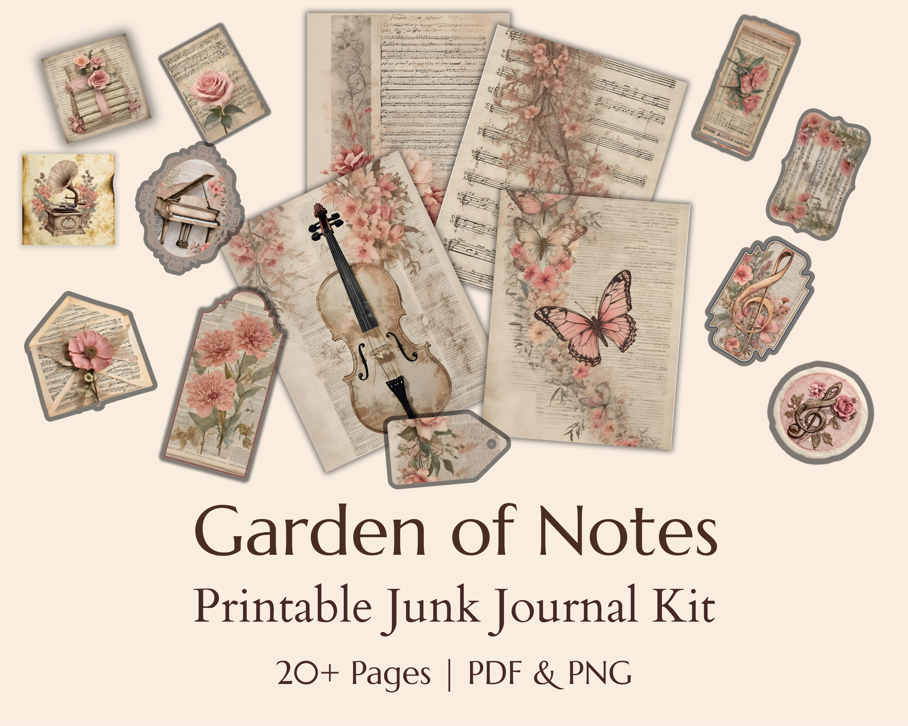 Unfold a melodic garden of creativity with this romantic, vintage-inspired Garden of Notes Junk Journal Kit. Featuring a beautiful mix of soft florals and antique music paper motifs, this printable kit is perfect for music lovers, journalers, and paper crafters who adore timeless, feminine designs.